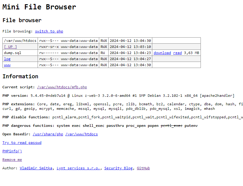 PHP Mini File Browser is really a primitive tool that helps me to detect forgotten files in web pages, to find out the structure of the application and mostly to detect site isolation issues on webhosts. This is unfortunately a more common problem than it seems, and thanks to my tool I have got non-authorized access to tens of thousands of sites.