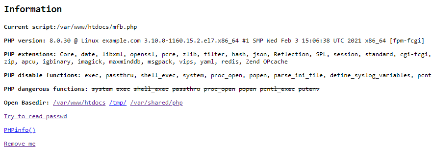 Another standard feature is to display information about PHP version, kernel and SAPI used. The information will also show installed extensions, open_basedir status, disabled_functions and a handy audit of available unsafe functions. If you need to know more, you can expand the phpinfo() function listing.