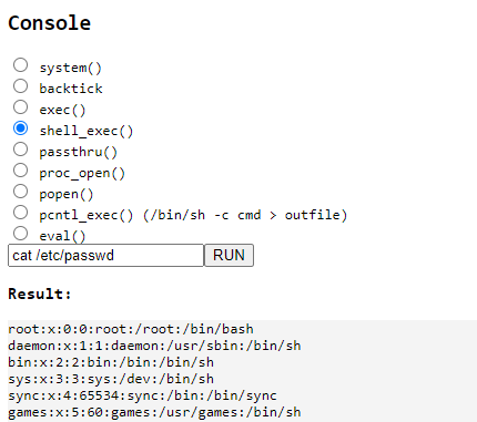 If the audit shows available unsafe functions, you can enable the dangerous “console” option and execute system commands using one of the available system functions in PHP.
