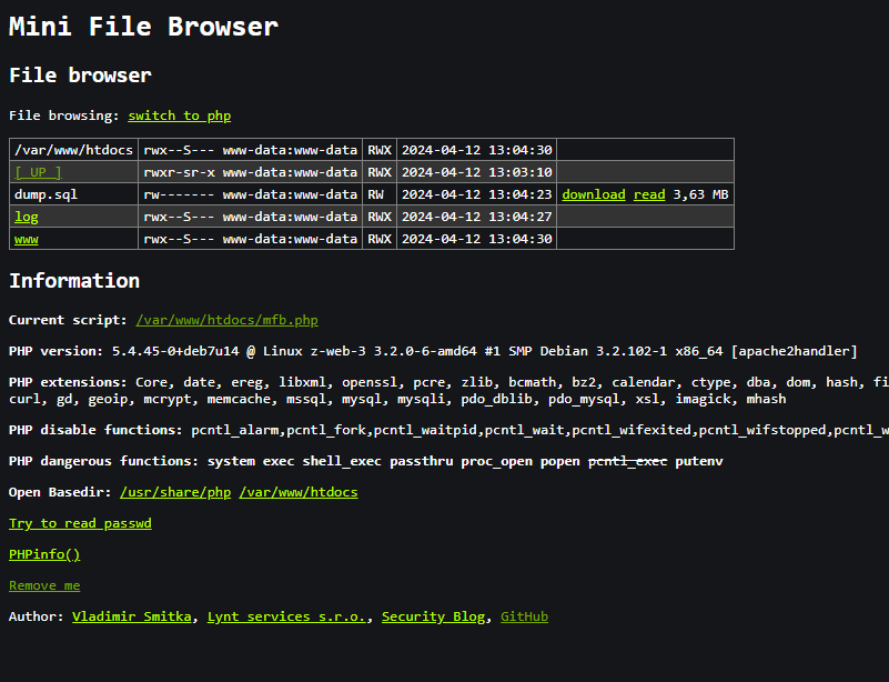 PHP Mini File Browser is really a primitive tool that helps me to detect forgotten files in web pages, to find out the structure of the application and mostly to detect site isolation issues on webhosts. This is unfortunately a more common problem than it seems, and thanks to my tool I have got non-authorized access to tens of thousands of sites.